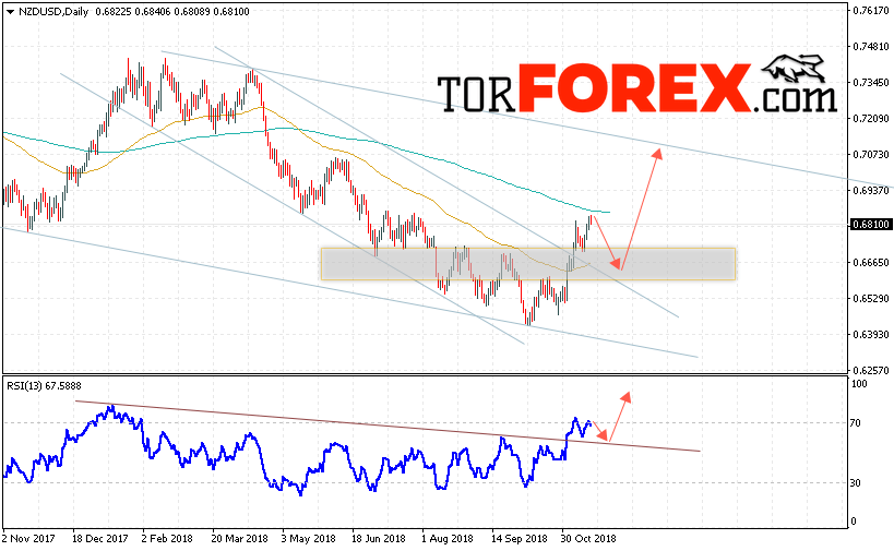 В пользу роста валютной пары NZD/USD выступит тест линии тренда на индикаторе относительной силы. А также отскок от верхней границы нисходящего канала. Отменой варианта роста котировок на текущей торговой неделе 19 — 23 ноября 2018 станет падение и пробой области 0.6500. Это укажет на пробой области поддержки и продолжение снижения пары NZD/USD. Подтверждением роста валютной пары на Форекс выступит пробой области сопротивления и закрытие котировок выше области 0.6860.