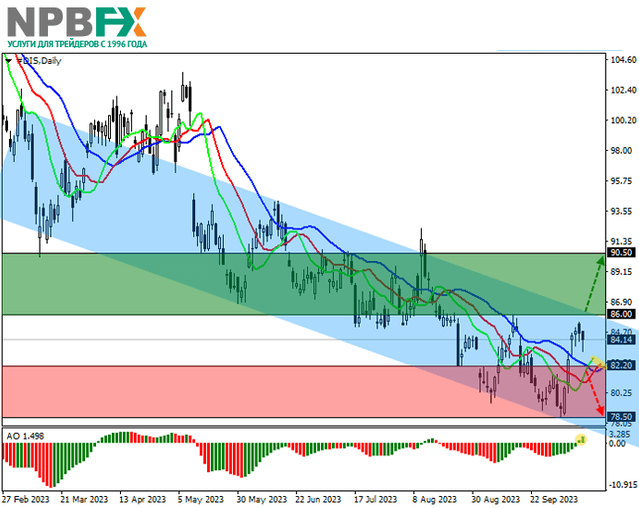 На дневном графике цена движется в глобальном нисходящем канале с динамическими границами 86.00–78.00, формируя волну роста.