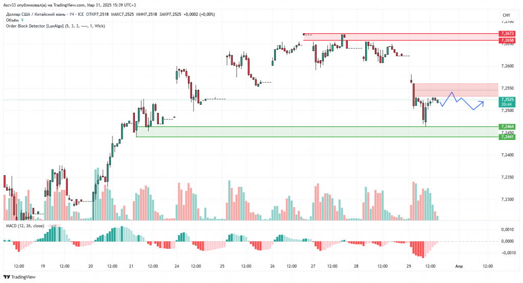 Пара демонстрирует признаки формирования базы после падения. В ближайшие часы критическим ориентиром станет поведение в зоне 7,2440–7,2650. До выхода за пределы этого диапазона возможны боковые колебания с уклоном в сторону накопления позиций.