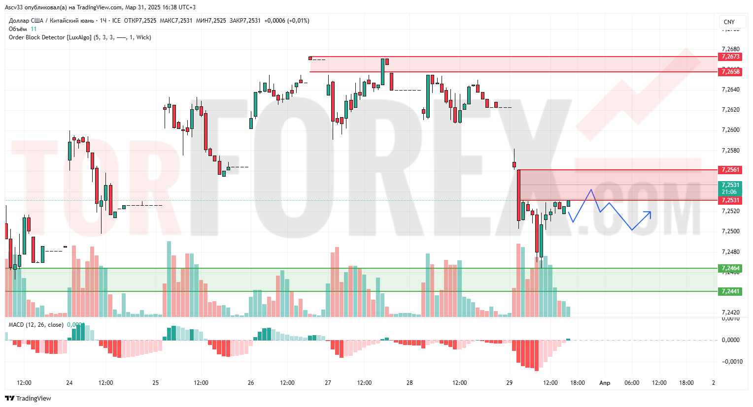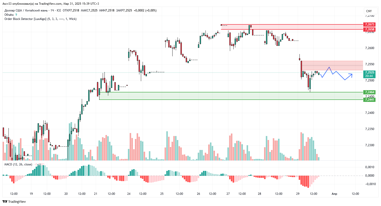 - 7,2658 – 7,2673 — верхняя зона предложения, где ранее наблюдалось давление со стороны продавцов;