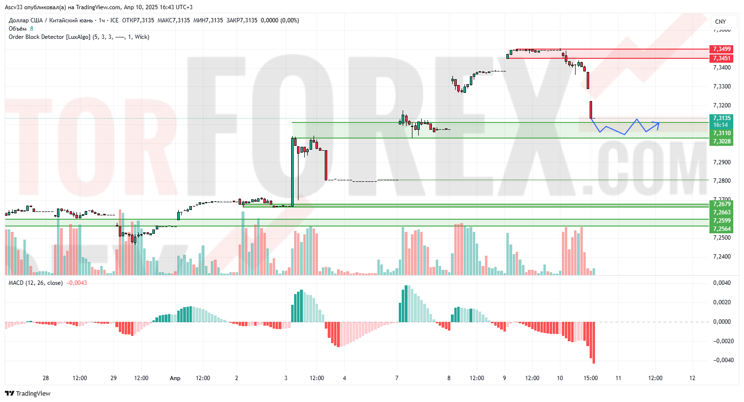 Пара USD/CNY резко снизилась от области сопротивления 7,3450–7,3500, пробив локальный восходящий тренд и достигнув уровня 7,3130. Цена протестировала зону спроса и формирует базу для возможной консолидации.