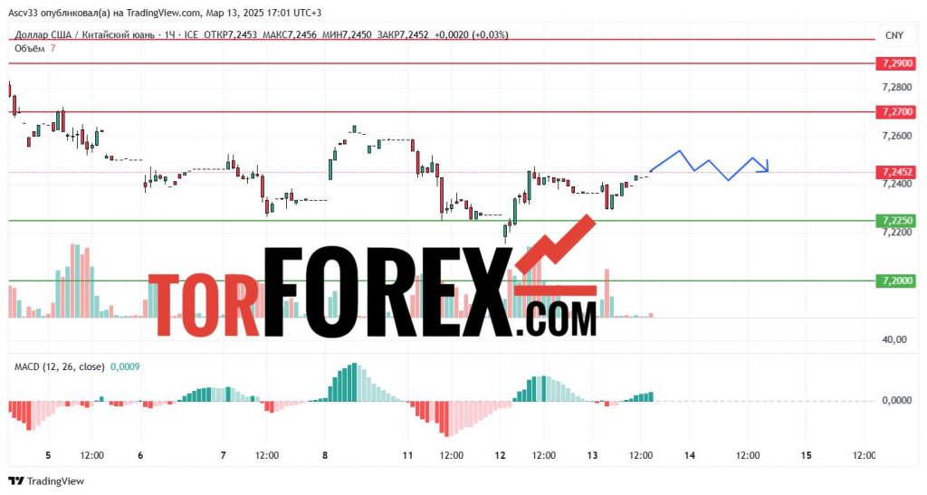 Скорее всего, USD/CNY останется в пределах 7,2250–7,2700 в течение следующих суток. Прорыв 7,2700 вверх может ускорить рост курса, тогда как снижение ниже 7,2250 усилит вероятность коррекции. Трейдерам рекомендуется внимательно следить за движением цены вблизи этих уровней, так как их пробой определит дальнейшую траекторию валютной пары.