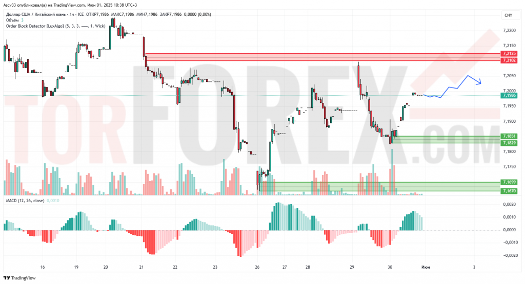 После отскока от поддержки в районе 7,1670–7,1820 пара USD/CNY демонстрирует краткосрочное восстановление. Цена приближается к области сопротивления 7,2000–7,2125. Индикатор MACD сохраняет позитивную динамику, однако объёмы указывают на снижение интереса к покупкам при приближении к верхней границе диапазона.