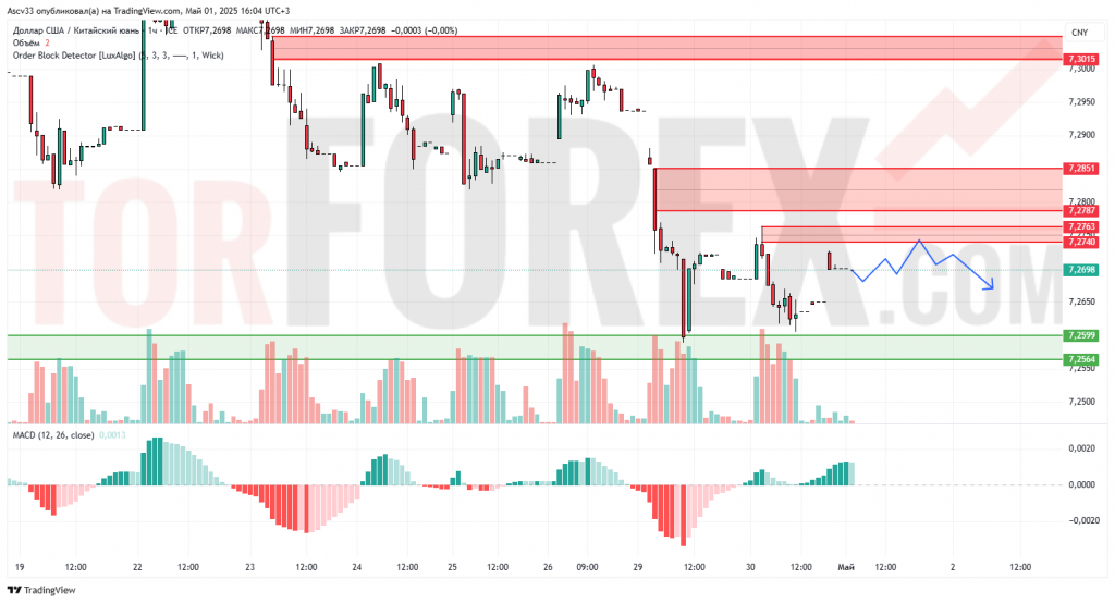Пара USD/CNY демонстрирует признаки восстановления после резкого снижения к поддержке в районе 7,2564. Однако текущее движение вверх ограничено зоной предложения в области 7,2740–7,2787, где ранее наблюдались продажи. Индикатор MACD начинает выходить из глубокой «медвежьей» зоны, но сигнал пока не подтверждён ростом объёмов — они остаются невысокими.