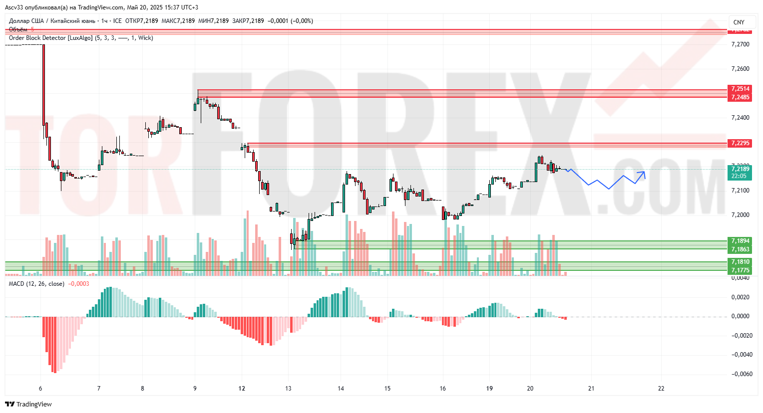 Пара USD/CNY стабилизировалась у отметки 7,22 после коррекционного роста. При приближении к этому уровню наблюдается снижение волатильности и слабая активность покупателей. Зона сопротивления 7,22–7,23 остаётся актуальной. Объёмы торгов сокращаются, а индикатор MACD демонстрирует нейтральную динамику, без чёткого импульса.