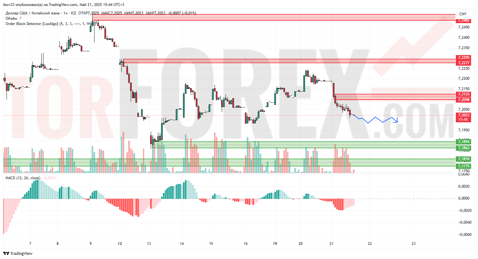 Пара USD/CNY находится под давлением после резкого снижения из зоны предложения 7,21–7,23. Пробой уровня 7,2100 закрепился, и цена продолжает снижаться. На фоне падения наблюдается умеренный объём, что указывает на отсутствие значимого спроса. Индикатор MACD находится в отрицательной зоне и не демонстрирует признаков разворота, что подтверждает доминирование медвежьих настроений.
