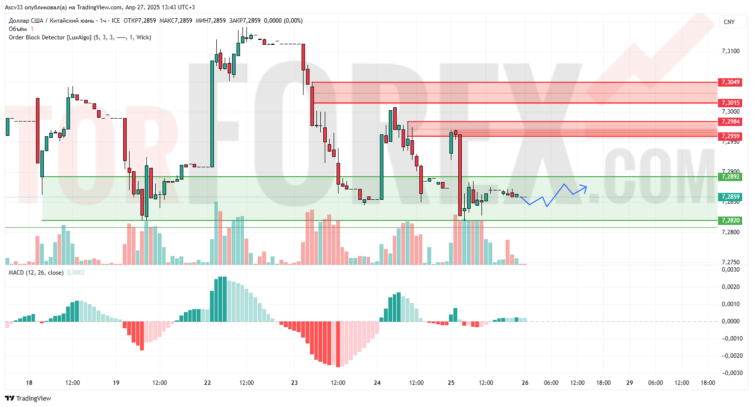 Пара USD/CNY консолидируется в диапазоне между зонами спроса и предложения. Поддержка в области 7.2820–7.2859 удерживает цену от дальнейшего падения. MACD демонстрирует слабую положительную динамику, но объёмы остаются низкими, что указывает на неопределённость участников рынка.