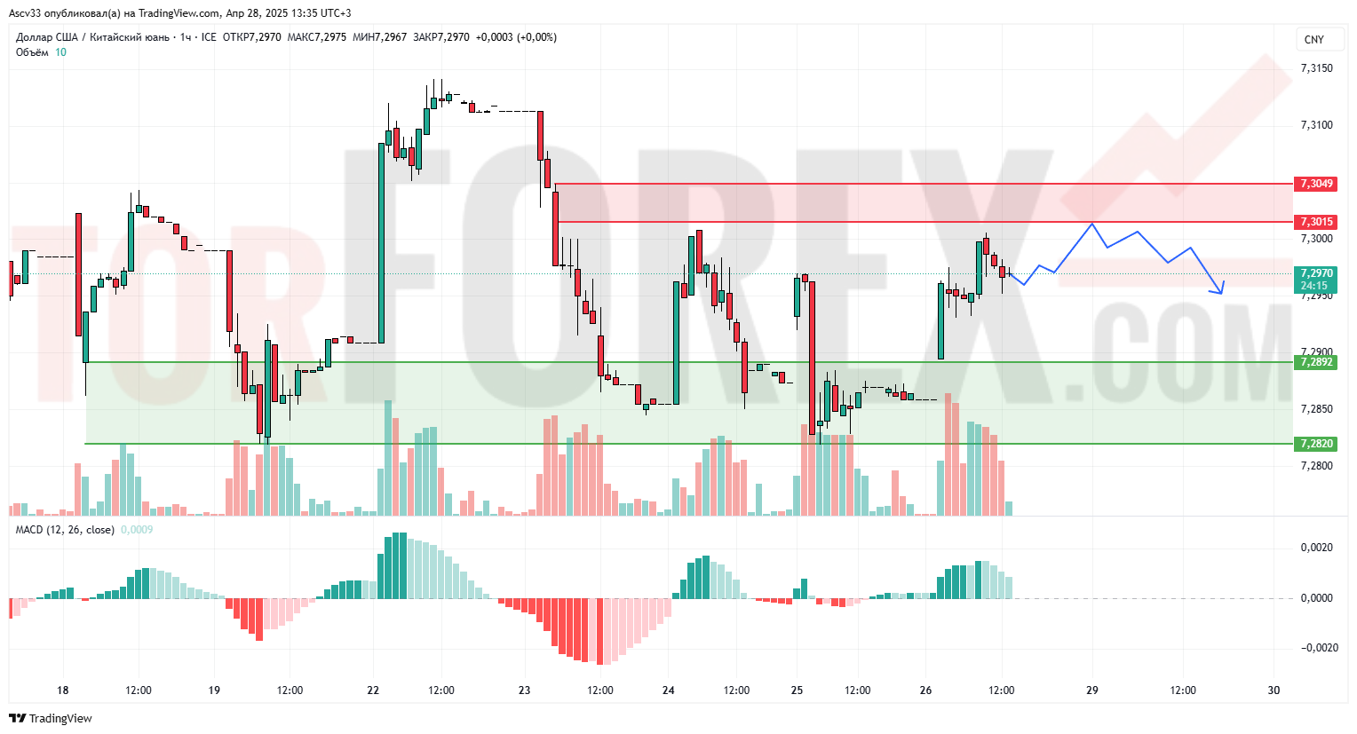 Вероятно формирование диапазона 7,2820–7,3015. Основной сценарий — консолидация с последующим снижением.