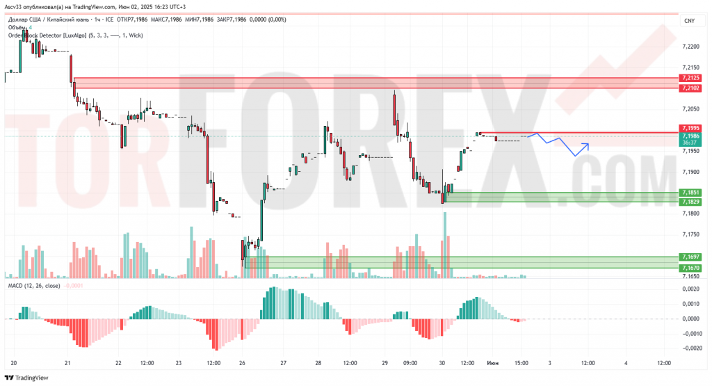 Пара USD/CNY консолидируется после восстановления от зоны поддержки 7.1670–7.1697. Цена приблизилась к ближайшей зоне сопротивления 7.1995, но пока не демонстрирует импульсного пробоя. Индикатор MACD указывает на замедление восходящего импульса, объёмы также остаются ниже средних значений.