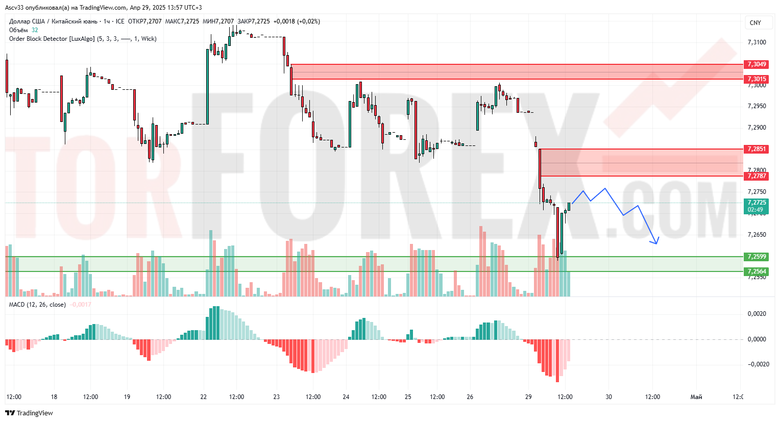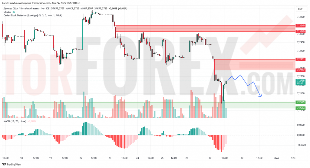 После резкого снижения пара USD/CNY отскочила от зоны поддержки 7.2564–7.2599 и сейчас консолидируется в узком диапазоне. На графике видна чёткая зона сопротивления 7.2787–7.2851, откуда ранее началось сильное снижение. Цена приближается к этой области на пониженных объёмах. Индикатор MACD показывает слабый положительный импульс, что может свидетельствовать о локальной коррекции, но без подтверждения силы покупателя.