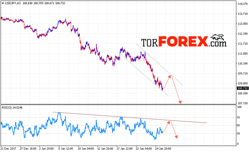 Таким образом, USD/JPY прогноз Доллар Иена на 26 января 2018 предполагает попытку теста верхней границы нисходящего канала вблизи области 109.50 и продолжения падения в область ниже уровня 107.75, в пользу падения выступит тест линии тренда на индикаторе относительной силы.