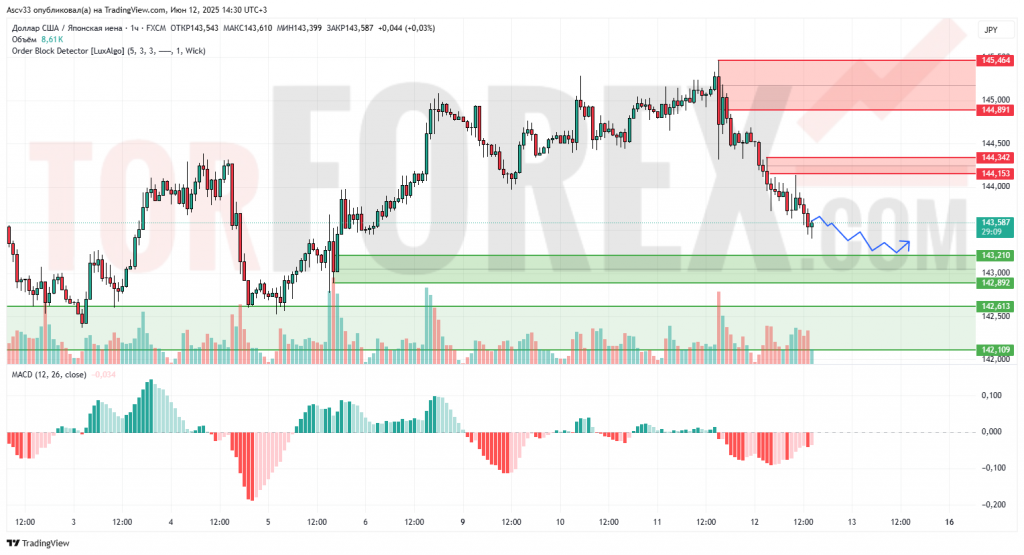 Сценарий снижения остаётся приоритетным. При пробое 143,20 пара может направиться в сторону 142,60. Только возврат выше 144,35 может сигнализировать о возможном развороте или коррекции. Текущий импульс указывает на продолжение нисходящего давления.