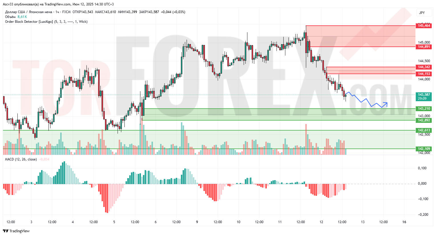 144,15–144,34 — ближайшая зона предложения, пробой которой ослабит давление продавцов.