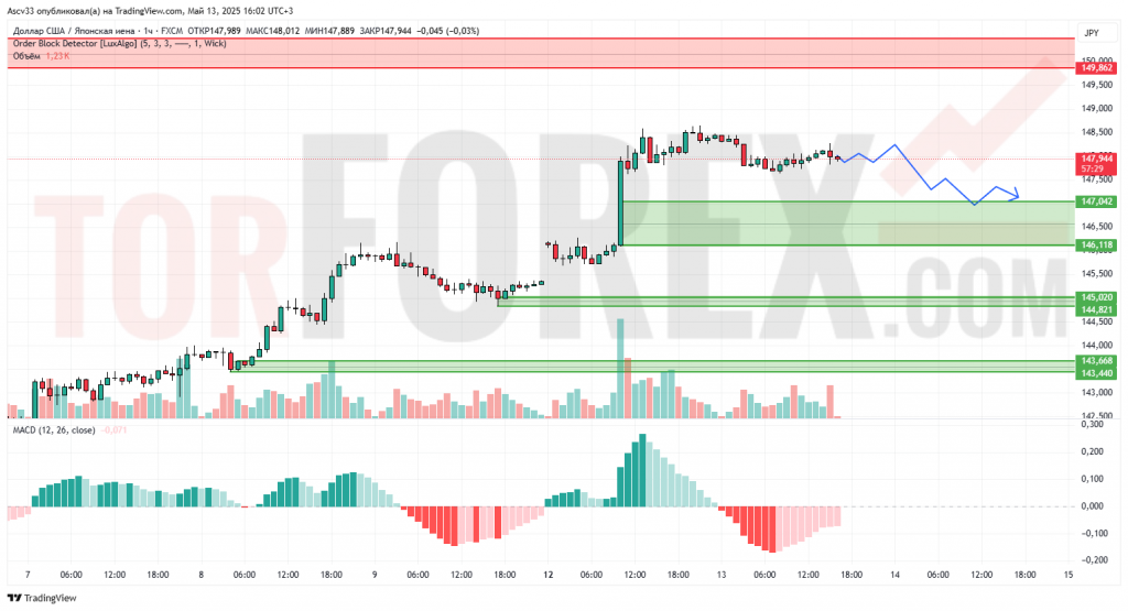 пара usd/jpy продолжает торговаться вблизи локальных максимумов после импульсного роста от уровня 146,12. зона 147,90–148,40 выступает в роли краткосрочного сопротивления, где наблюдается снижение темпа роста. индикатор macd демонстрирует расхождение и формирует нисходящий импульс, что говорит о вероятности локальной коррекции.