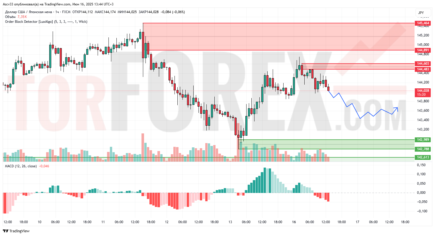Вероятно развитие нисходящего движения в зону 143,60 с возможным тестом уровня 142,98 при усилении давления. Устойчивое восстановление выше 144,60 отменит медвежий сценарий и откроет путь к верхним уровням.