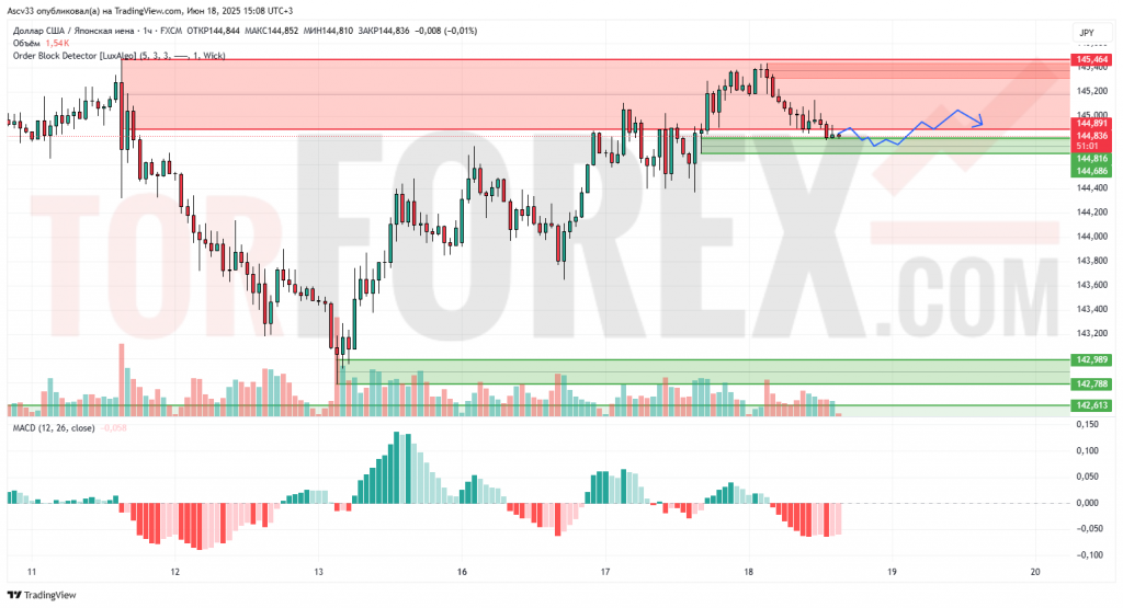 USD/JPY торгуется вблизи верхней границы области сопротивления, после отскока от локального минимума у 143,50. Повышение замедлилось, и пара входит в фазу консолидации в зоне 144,50–145,00.