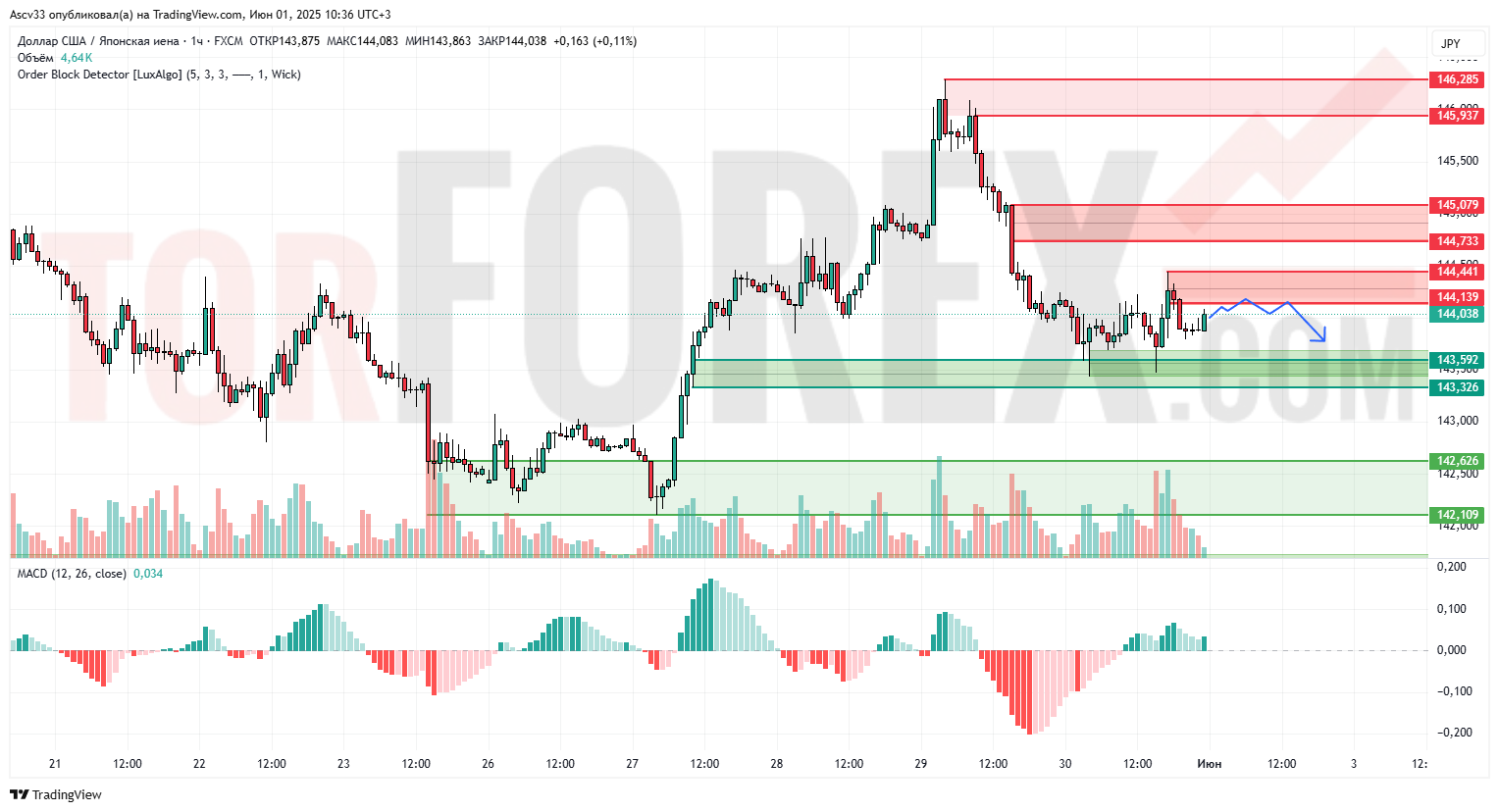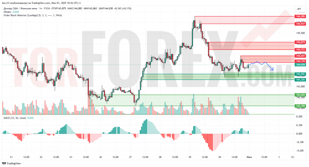Пара USD/JPY стабилизировалась после отката от уровня 145,90 и теперь тестирует зону предложения 144,10–144,44. Восходящее восстановление замедляется, MACD демонстрирует слабую положительную динамику, но объёмы остаются умеренными. Это может указывать на формирование локального максимума и начало нового нисходящего импульса.
