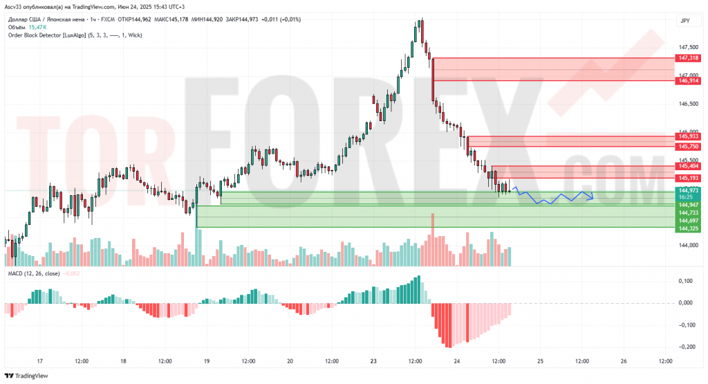 Ожидается продолжение консолидации в пределах 144,70–145,20. При пробое вниз возможен откат к 144,30–144,00. Рост возможен только при уверенном закреплении выше 145,20.