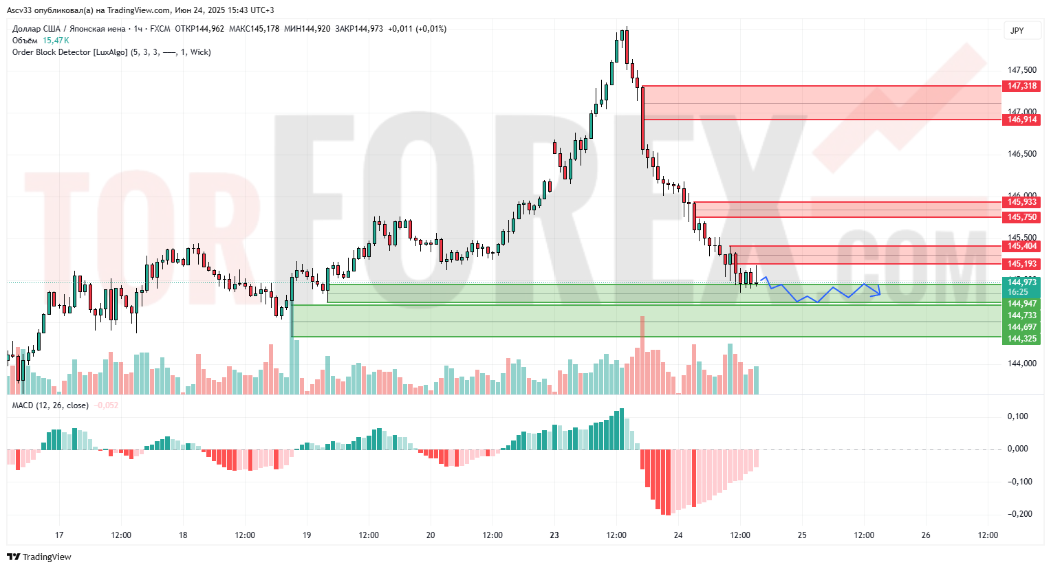 Пара USD/JPY после стремительного роста столкнулась с сильным сопротивлением на уровне 147,31 и ушла в коррекцию. Цена сейчас консолидируется вблизи уровня поддержки 144,95, которая совпадает с предыдущей зоной спроса. Наблюдается снижение объёмов на падающем участке, что может свидетельствовать об ослаблении давления продавцов. Индикатор MACD указывает на завершение нисходящего импульса, но пока сохраняется в негативной зоне.