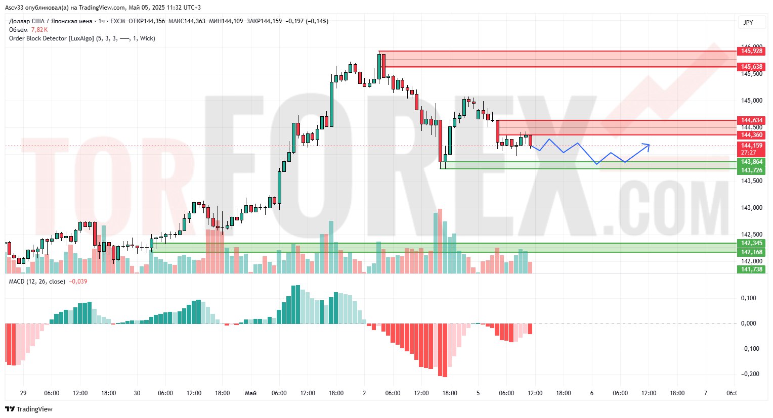 Ожидается колебание в диапазоне 143.72–144.63 с попыткой выхода вверх. Если покупатели пробьют зону 144.63, цена может вернуться к 145.60. В противном случае возможен ретест 143.72.
