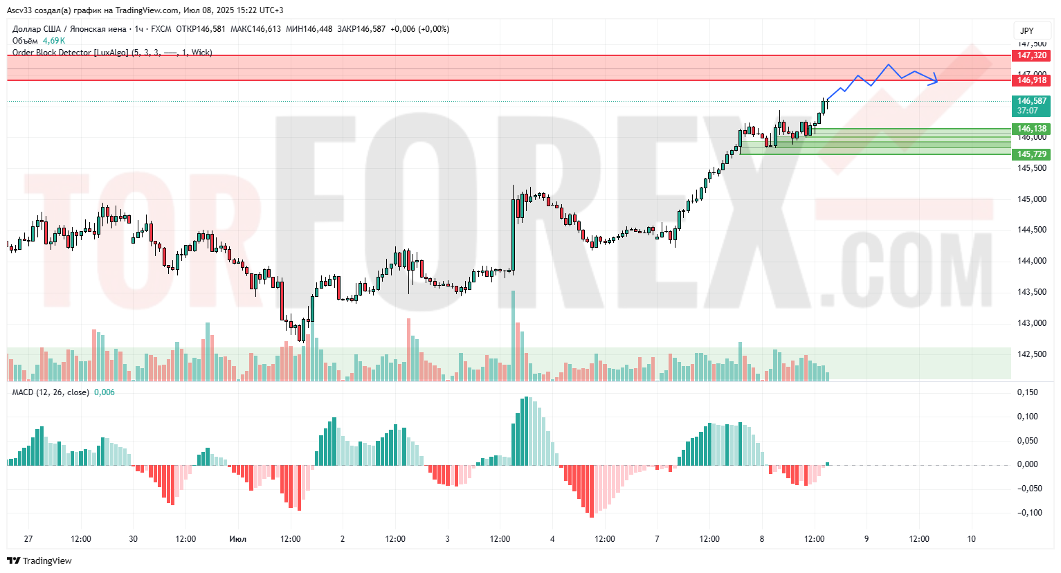 Ожидается движение в диапазоне 146.60–147.30 с возможной консолидацией или коррекцией от сопротивления. При пробое 147.32 продолжение роста вероятно. Сценарий — нейтрально-бычий с риском краткосрочной коррекции от зоны предложения.