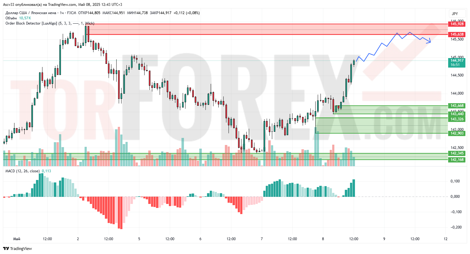 USD/JPY демонстрирует уверенное восходящее движение, пробив ключевые уровни сопротивления и приблизившись к области 145,60–145,90. Эта зона ранее служила разворотным уровнем. Индикатор MACD показывает сильный положительный импульс, что подтверждает силу покупок, однако сигналы перекупленности начинают формироваться.