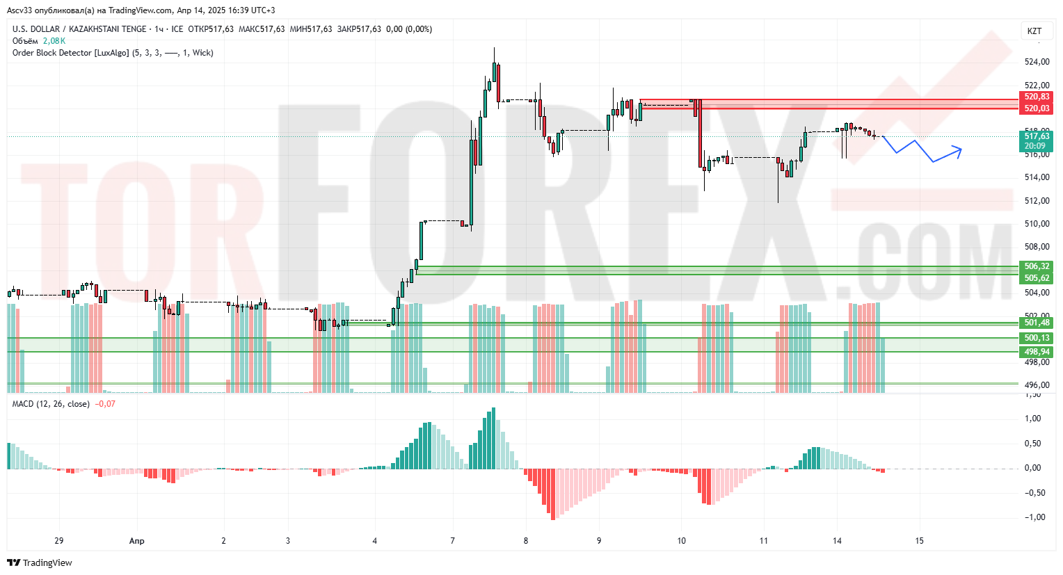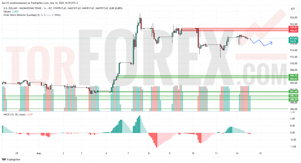 После импульсного роста к 521.00 курс USD/KZT сформировал зону сопротивления около 520.00–520.80, от которой происходит откат. Цена консолидируется вблизи 517.50, показывая признаки замедления восходящего импульса. MACD сигнализирует о возможной смене направления, гистограмма снижается.