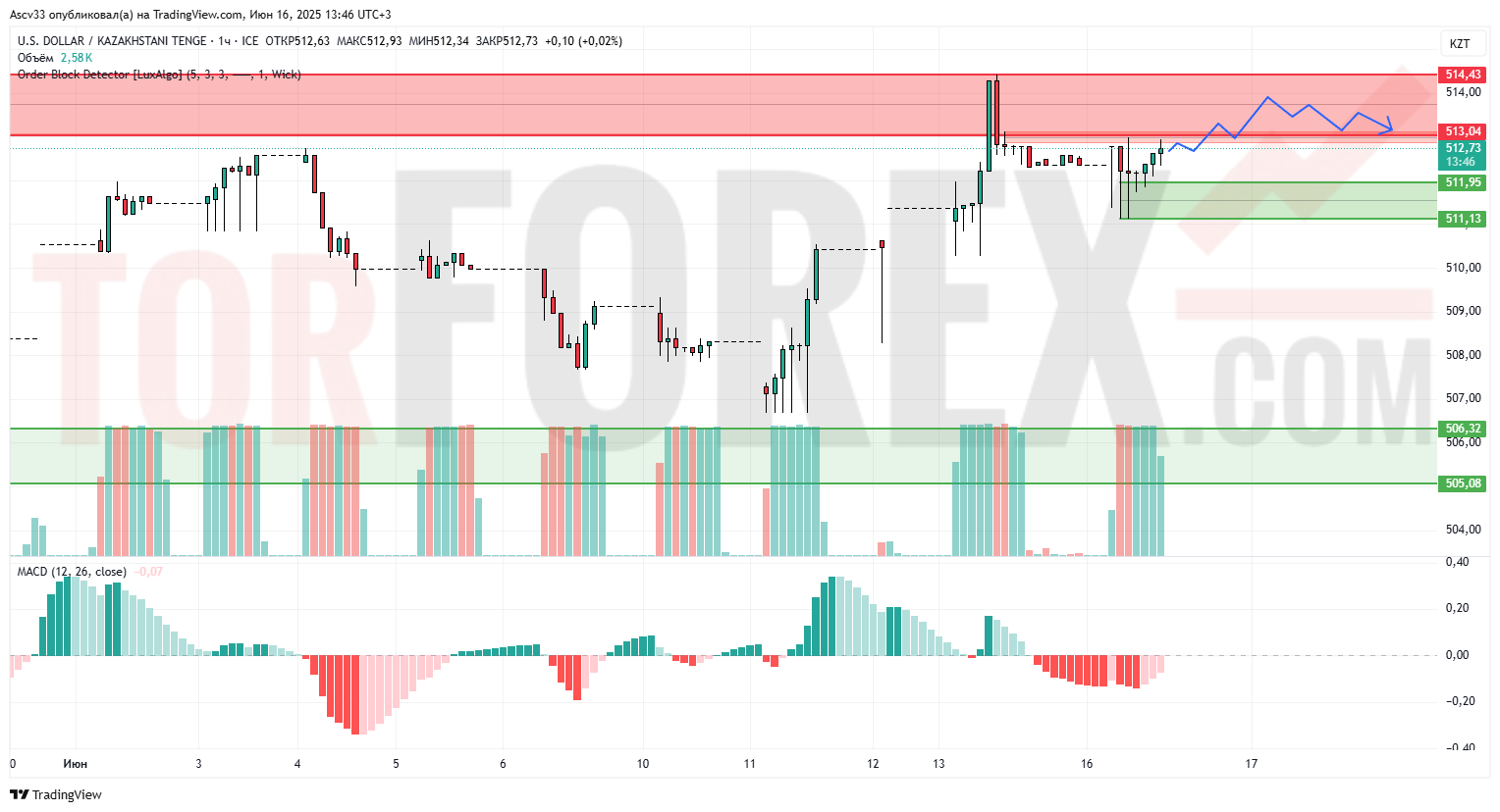 Пара USD/KZT тестирует зону сопротивления 513,04–514,43 после резкого импульса вверх. Видна попытка закрепления выше уровня 512, но активность покупателей ослабевает. Это указывает на возможное формирование разворотной модели вблизи верхней границы зоны предложения.