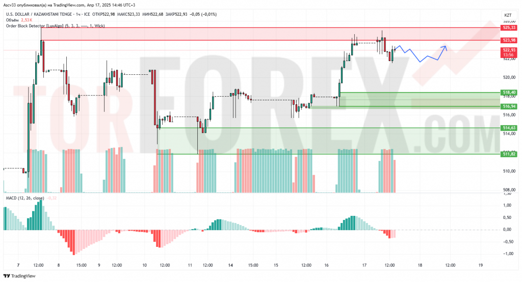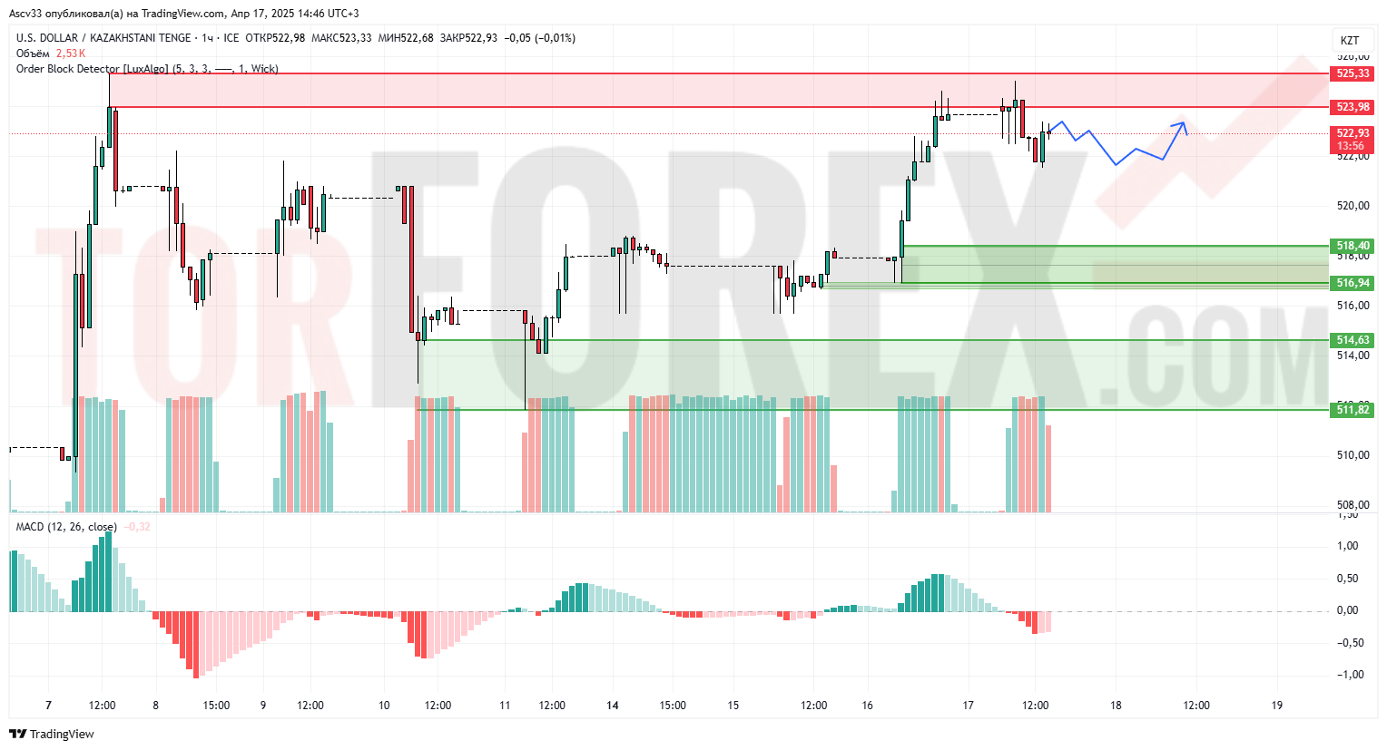 Валютная пара USD/KZT консолидируется под сопротивлением 523.98 после восходящего импульса от уровней 516.94. Пара демонстрирует попытки стабилизации, но остаётся ниже ключевого сопротивления. MACD у нулевой линии с лёгким уклоном вниз, что говорит о слабости текущего бычьего движения. Объёмы уменьшились после роста, что указывает на отсутствие активности покупателей.