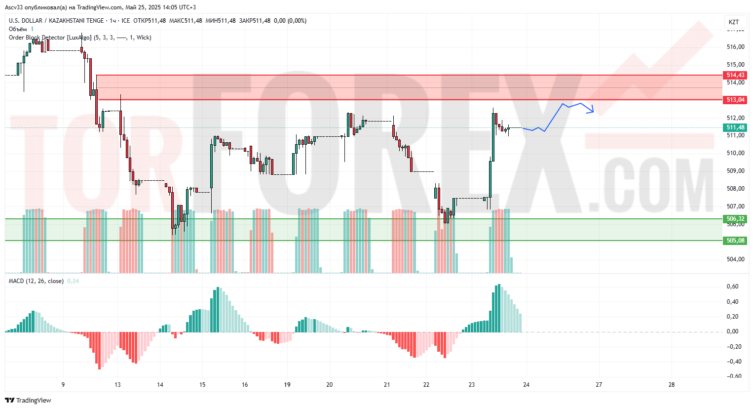 - 511,00 — 511,48 KZT — текущая локальная поддержка, которая может сдержать небольшие коррекции.