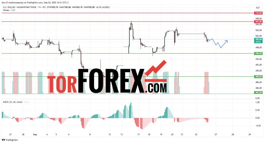 - 488,00 — в случае пробоя вниз возможно углубление отката в пользу тенге.