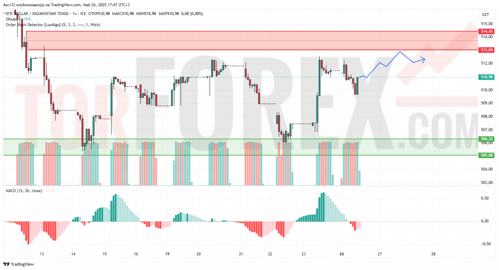 Ожидается, что пара USD/KZT продолжит попытки роста в сторону зоны сопротивления 513,04 – 514,43. Успешный пробой и закрепление выше 514,43 с увеличением объемов может привести к дальнейшему росту. Однако, если цена не сможет преодолеть это сопротивление, возможна коррекция к уровням поддержки 506,00 – 506,32.
