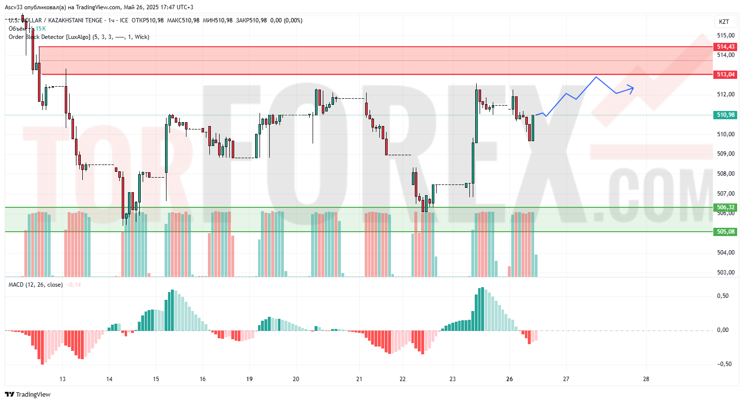 Пара USD/KZT находится в фазе консолидации после недавнего снижения, но с потенциалом к росту. Текущая цена 510,98 расположена ниже сильной зоны сопротивления, отмеченной красным цветом (513,04 — 514,43). На графике видно, что после падения цена нашла поддержку в районе 506,00 и демонстрирует попытки восстановления. Индикатор MACD находится в положительной зоне, и его гистограмма увеличивается, что указывает на появление бычьего импульса. Объемы торгов остаются умеренными.