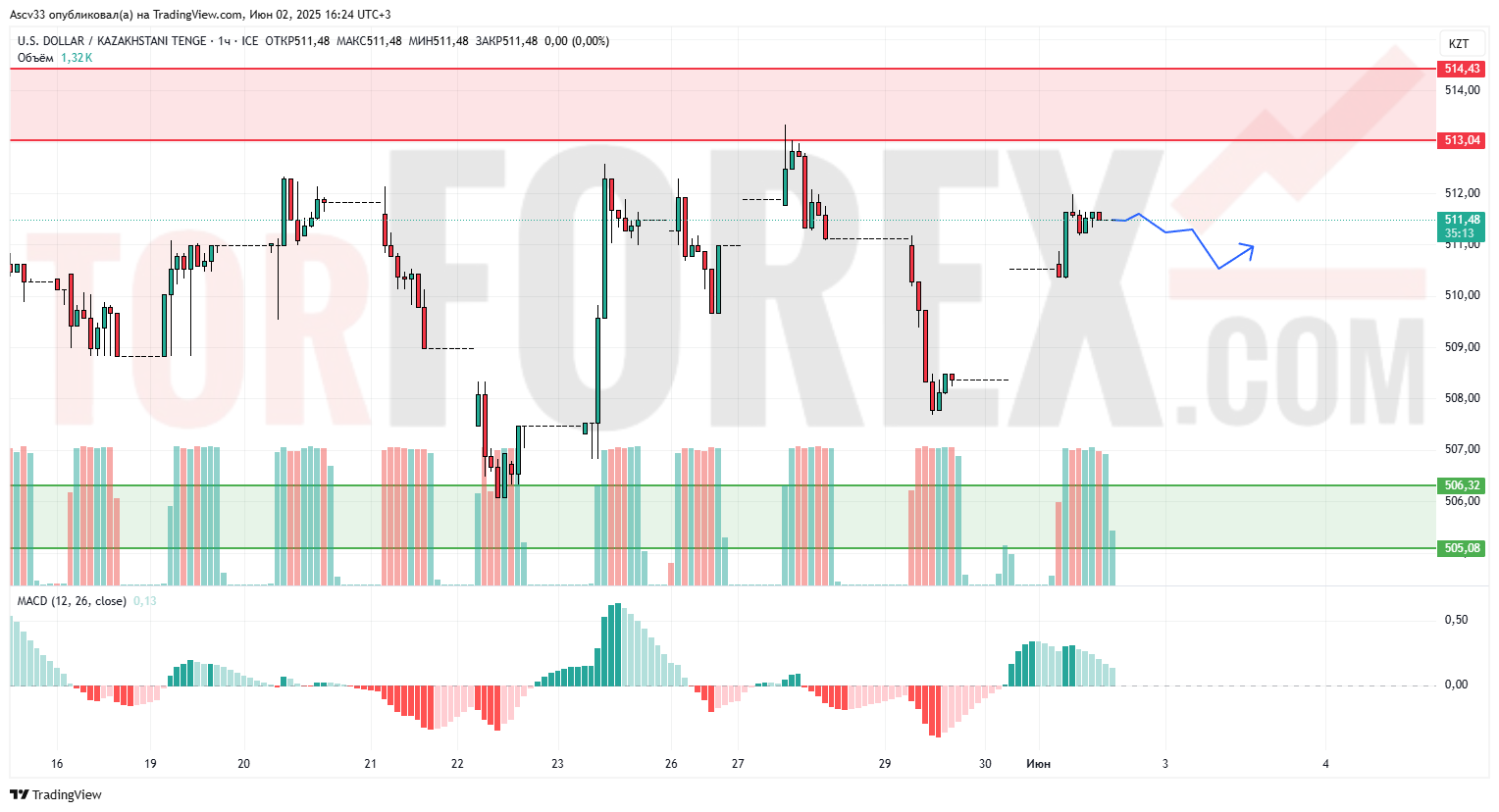 USD/KZT торгуется в узком диапазоне у уровня 511.50 после отскока от поддержки. На графике наблюдается замедление после недавнего восстановления, при этом объёмы остаются низкими, а MACD сигнализирует об исчерпании краткосрочного импульса.