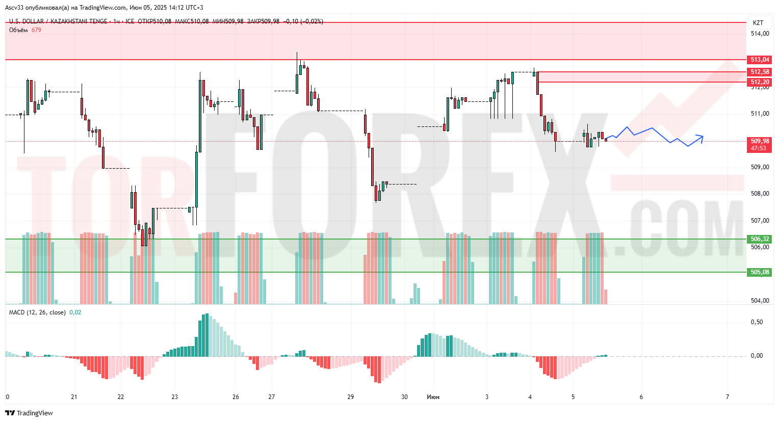 Пара USD/KZT торгуется вблизи локальной поддержки 509,50–510,00 после краткосрочного снижения. На графике наблюдается консолидация в узком диапазоне, что может указывать на подготовку к пробою. Индикатор MACD вышел в нейтральную зону и демонстрирует признаки потенциального разворота вверх, но пока без явного импульса.