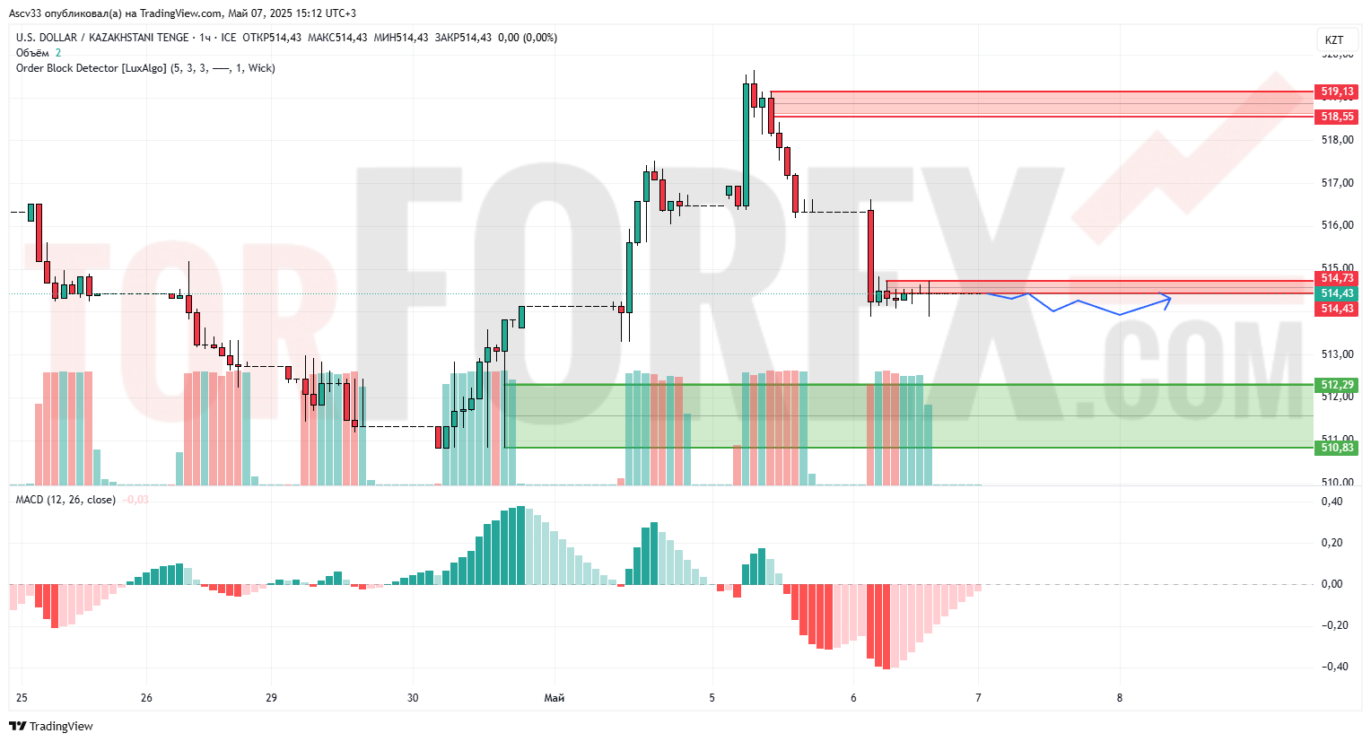 Пара USD/KZT консолидируется в районе 514 после неудачной попытки закрепиться выше зоны сопротивления 518,5–519,1. Рынок демонстрирует сдержанную динамику с пониженной волатильностью. Индикатор MACD продолжает находиться в отрицательной зоне, что указывает на наличие нисходящего давления.