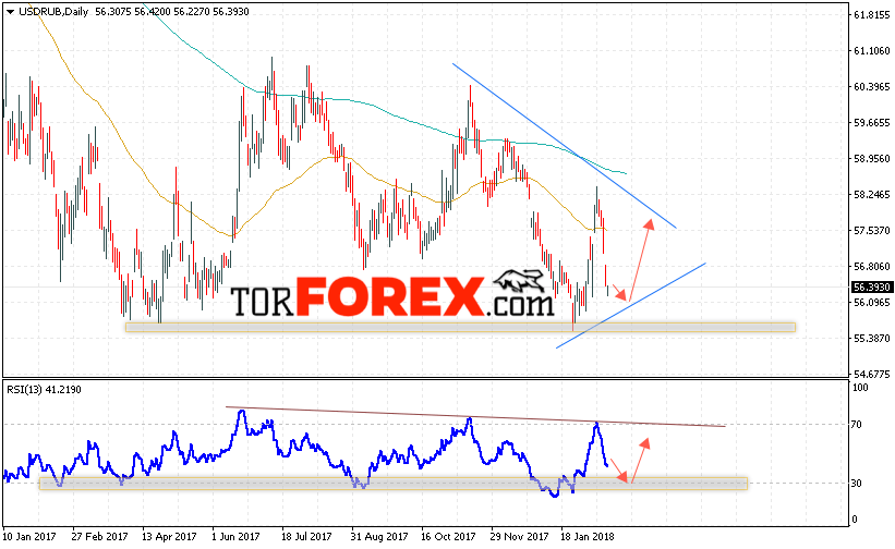 Таким образом, USD RUB прогноз курса Доллара на 19 — 23 февраля 2018 предполагает попытку теста нижней границы модели «Треугольник» вблизи уровня 56.05, откуда стоит ожидать попытку роста Доллара в область выше уровня 57.60, в пользу роста пары выступит тест области поддержки на индикаторе относительной силы, отменой варианта роста курса Доллара на текущей торговой неделе станет падение и пробой области 55.20, что укажет на продолжение падения ниже уровня 54.00.