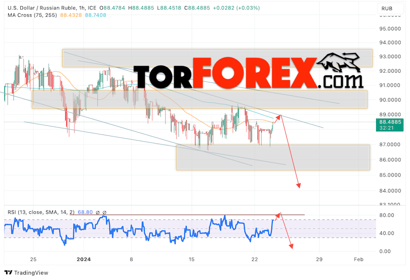 Валютная пара Доллар Рубль USD/RUB продолжает движение в рамках развития падения и медвежьего канала. В момент публикации прогноза курс Доллара США к Российскому Рублю составляет 88.48. Скользящие средние указывают на наличие краткосрочной медвежьей тенденции. Цены вновь тестируют область между сигнальными линиями, что указывает на давление со стороны продавцов американской валюты и потенциальное продолжение падения Доллара США против Российского Рубля. В рамках прогноза курса Доллара на 24 января 2024 стоит ожидать попытку развития бычьей коррекции цены и тест уровня сопротивления вблизи области 89.05 Рублей за Доллар США. Затем, отскок вниз и продолжение падения валютной пары в область ниже уровня 84.05.