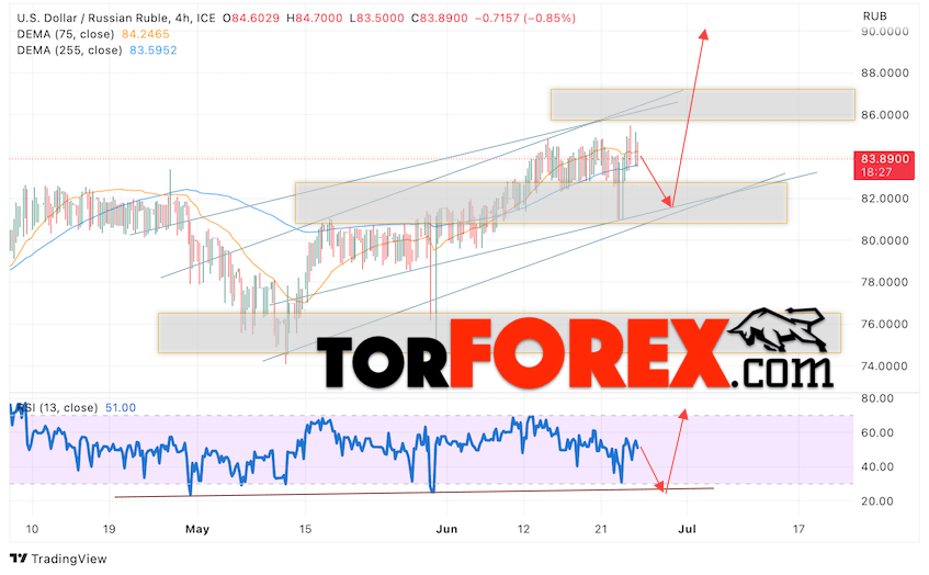 Валютная пара Доллар Рубль USD/RUB продолжает движение в рамках роста и бычьего канала. В момент публикации прогноза курс Доллара США к Российскому Рублю составляет 83.89. Скользящие средние указывают на наличие краткосрочной бычьей тенденции. Цены вновь тестируют область между сигнальными линиями, что указывает на давление со стороны продавцов американской валюты и потенциальное продолжение падения Доллара США против Российского Рубля. В рамках прогноза курса Доллара на 27 июня 2023 стоит ожидать попытку развития коррекции цены и тест уровня поддержки вблизи области 81.85 Рублей за Доллар США. Затем, отскок вверх и продолжение роста валютной пары в область выше уровня 90.05.