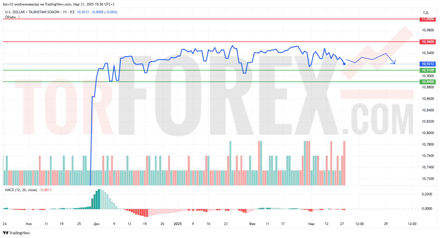 В краткосрочной перспективе USD/TJS, вероятно, продолжит движение в диапазоне 10,9100–10,9600. Пробой вверх откроет потенциал роста к 11,0000. При снижении ниже 10,9100 вероятен откат в район 10,8900.