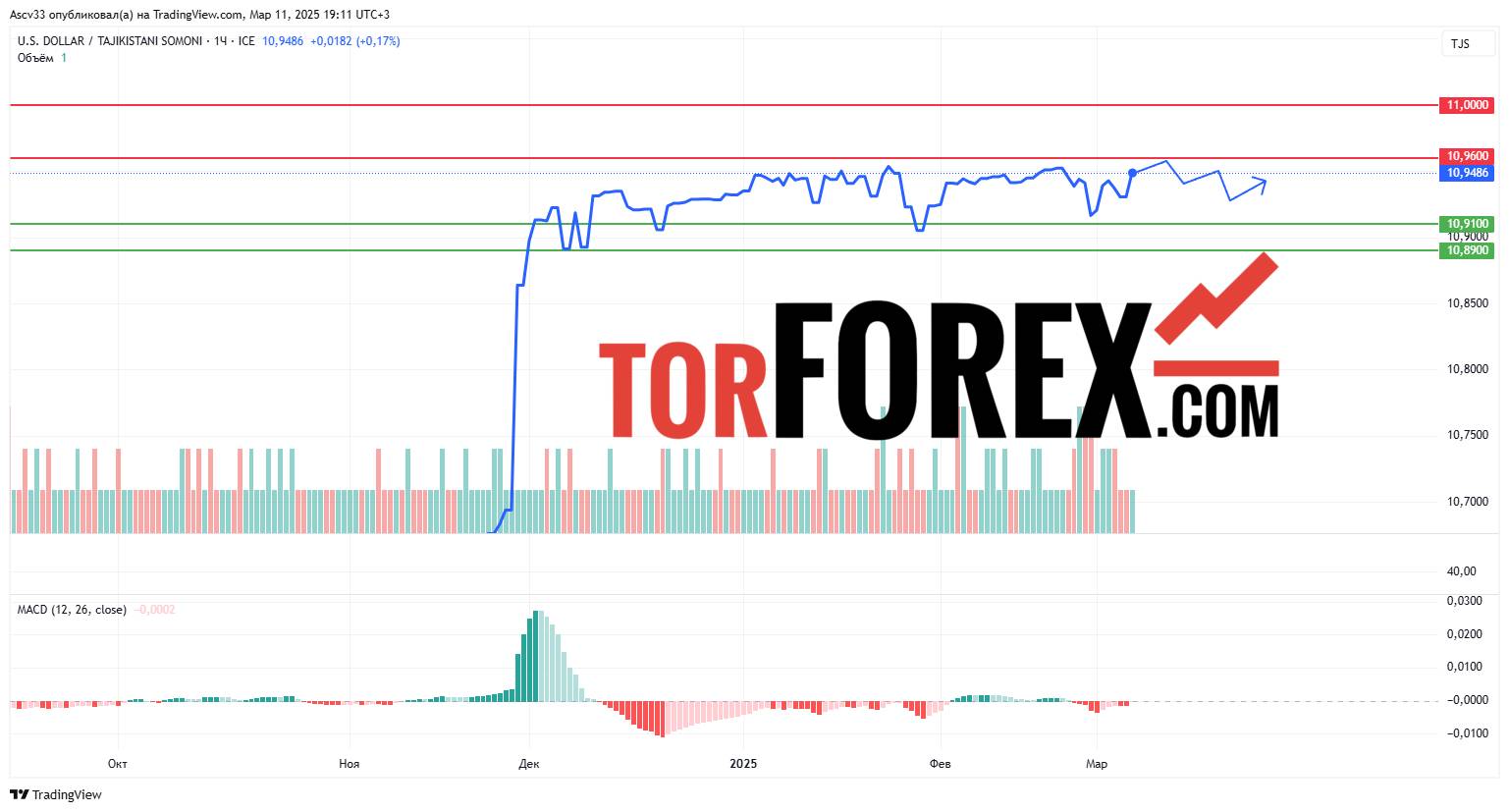 Ожидается, что USD/TJS останется в пределах 10,91–10,96 в течение следующих суток. Закрепление выше 10,96 может привести к росту курса, тогда как пробой 10,91 вниз усилит нисходящий тренд. Трейдерам рекомендуется следить за реакцией рынка вблизи этих уровней, так как их пробой определит дальнейшую траекторию движения валютной пары.