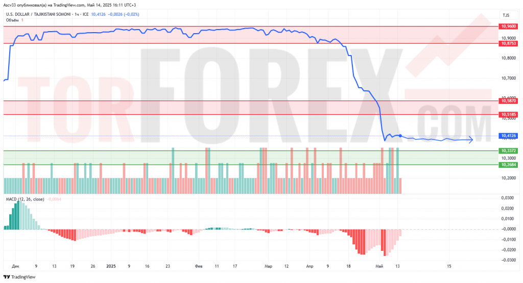 Курс USD/TJS продолжает консолидироваться в узком диапазоне после стремительного падения, завершившегося вблизи уровня 10,41. Активность рынка остаётся слабой, объёмы на минимальных значениях. Индикатор MACD продолжает удерживаться в глубокой отрицательной зоне, что указывает на затяжной нисходящий импульс без признаков разворота. Зона 10,34–10,26 остаётся ключевой поддержкой.