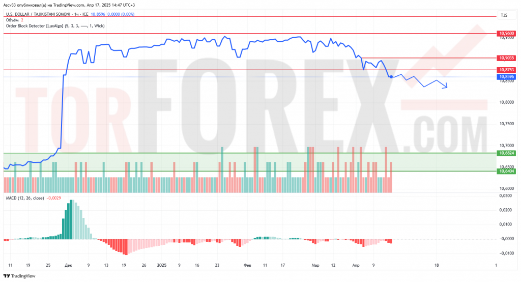 Валютная пара USD/TJS продолжает плавно снижаться в рамках затяжной коррекции от уровня 10.9035. Цена закрепилась ниже важного уровня 10.8753, указывая на доминирование продавцов. MACD находится в отрицательной зоне, что подтверждает нисходящую динамику. Объёмы остаются слабыми, активность на рынке минимальная.