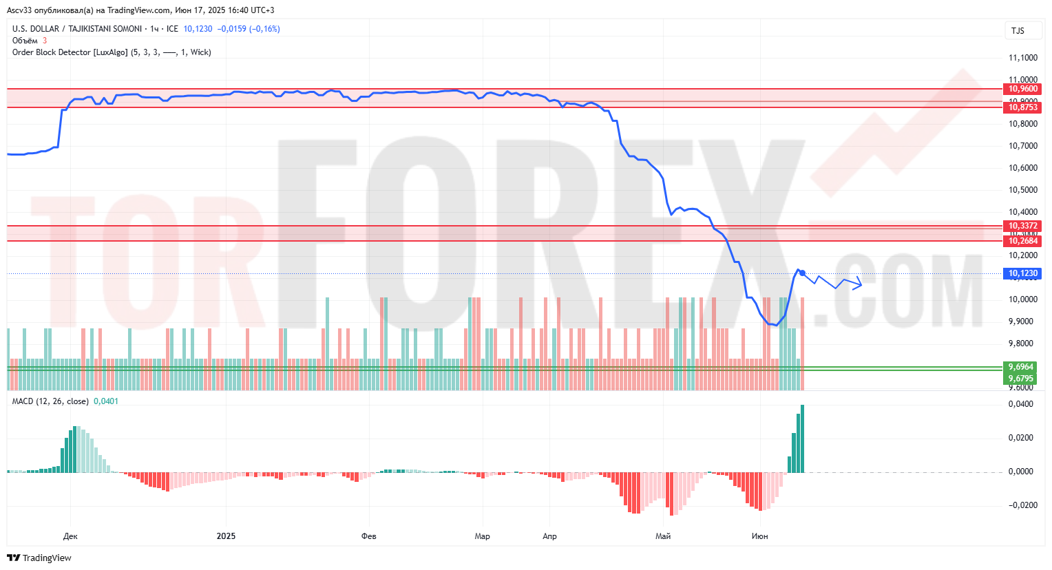 После затяжного нисходящего тренда, который продолжался с апреля, пара USD/TJS предприняла попытку разворота от области ниже 10,00. Однако восходящий импульс замедляется у границы 10,20, не преодолев зону предложения.