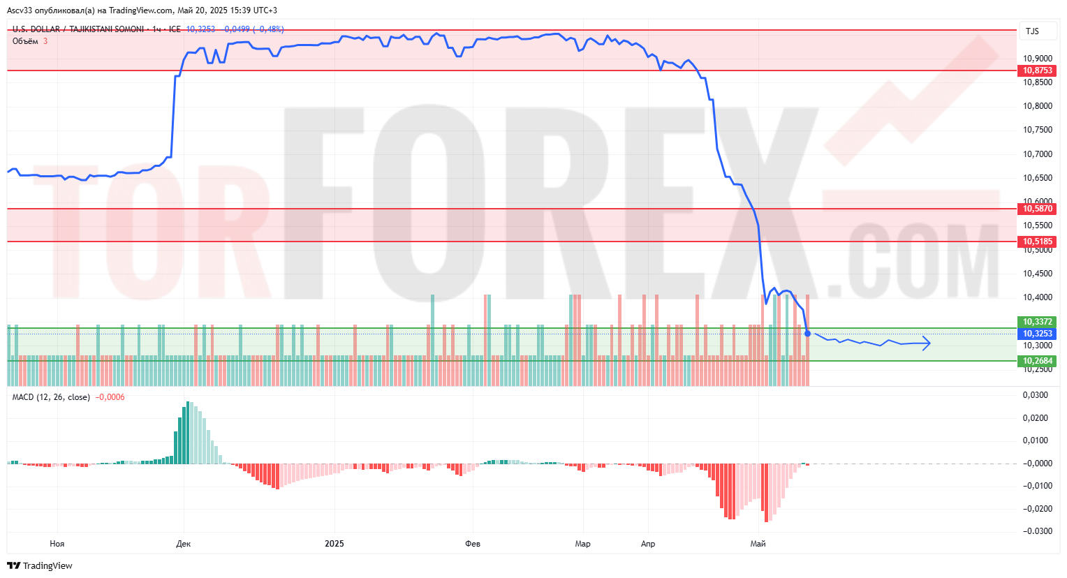 Курс USD/TJS остаётся в фазе устойчивой консолидации после резкого снижения, удерживаясь в пределах диапазона 10,30–10,34. Попытки восстановиться выше блокируются слабым покупательским интересом. MACD остаётся в отрицательной зоне, но постепенно приближается к нулевой отметке, сигнализируя о возможной стабилизации. Объёмы остаются низкими, что подтверждает отсутствие импульса.