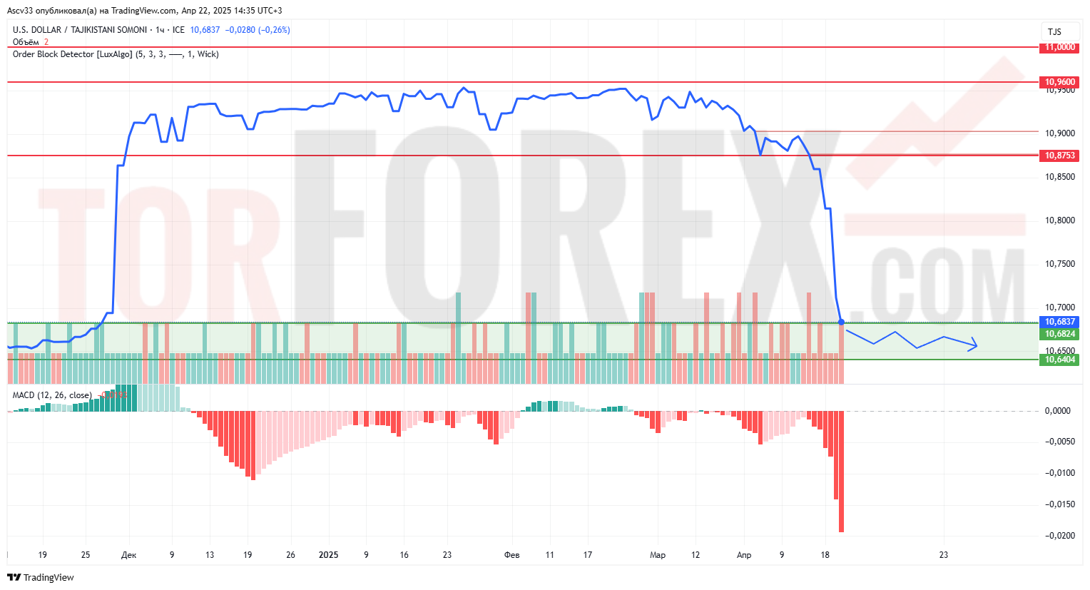 Пара USD/TJS продолжает устойчиво снижаться после пробоя ключевой поддержки 10.8753. Сейчас цена торгуется чуть выше зоны поддержки 10.6824. MACD глубоко в отрицательной зоне, что подтверждает сильное доминирование продавцов. Объёмы продаж остаются высокими, а структура движения указывает на возможное дальнейшее ослабление доллара против сомони.