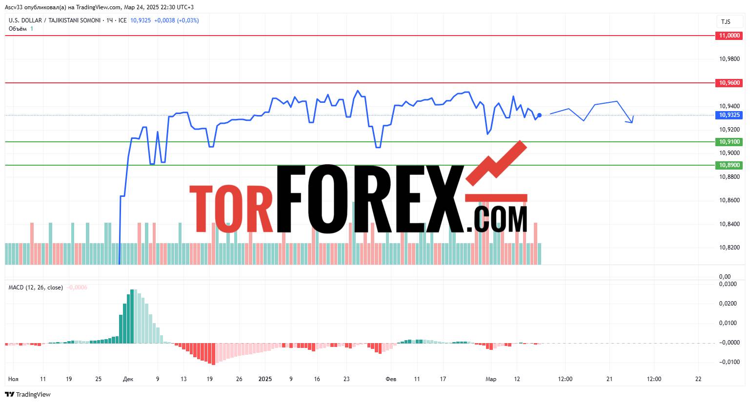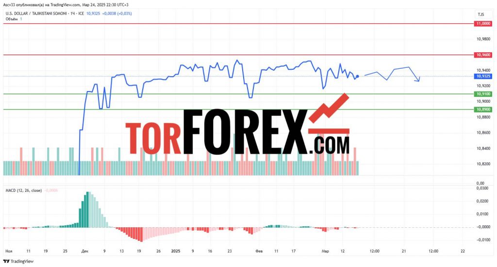 В течение следующих суток USD/TJS, с высокой вероятностью, останется в диапазоне 10,9100–10,9600. Прорыв уровня 10,9600 вверх может свидетельствовать о продолжении восходящего импульса. В случае пробоя вниз 10,9100, возможно развитие умеренной коррекции. Трейдерам стоит отслеживать реакцию курса в районе 10,91 и 10,96 — именно эти зоны могут задать дальнейшее направление движения в краткосрочной перспективе.