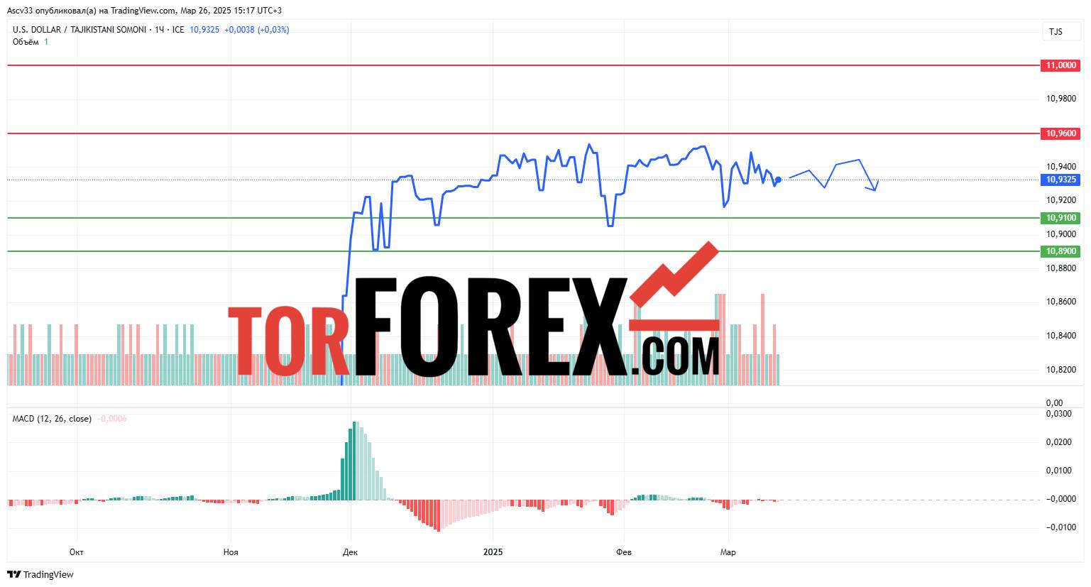 На ближайшие сутки ожидается сохранение курса в диапазоне 10,9100–10,9600. Если пара сумеет закрепиться выше 10,9600, это может стать отправной точкой для движения к 11,0000. В случае снижения ниже 10,9100 не исключено возвращение к 10,8900. USD/TJS продолжает торговаться в режиме боковой стабилизации, без выраженного тренда. Участникам рынка стоит ориентироваться на ключевые уровни 10,9100 и 10,9600 — их пробой может определить направление следующего импульса. Пока преобладает нейтральный настрой с ограниченной волатильностью.