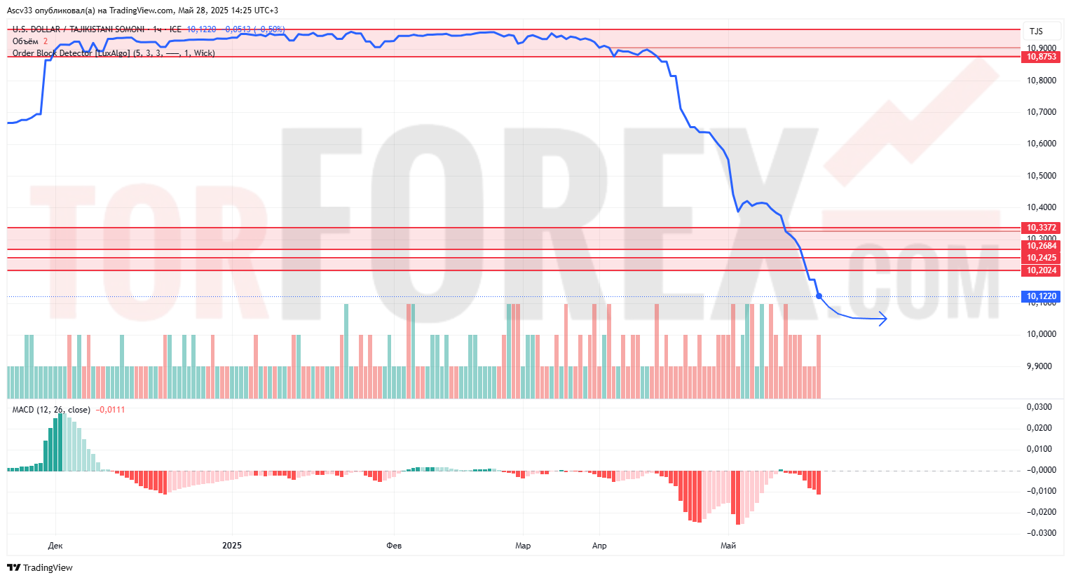 Пара USD/TJS продолжает снижение в рамках устойчивого нисходящего тренда. Цена пробила ключевые уровни 10,24 и 10,20 и закрепилась ниже, приближаясь к новым минимумам. Объёмы остаются стабильными, при этом MACD глубоко в отрицательной зоне, что подтверждает силу медвежьего импульса. Структура графика указывает на отсутствие признаков разворота.