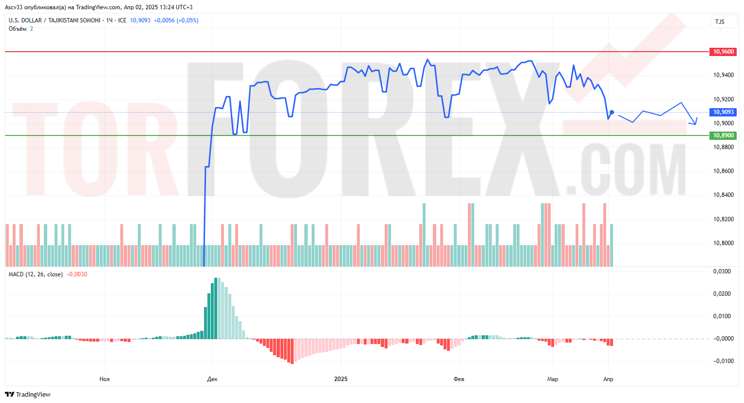 На часовом графике пары USD/TJS наблюдается слабая волатильность и боковая консолидация в пределах узкого диапазона. Цена стабилизировалась вблизи ключевого уровня 10,91, при этом признаки направленного импульса отсутствуют.